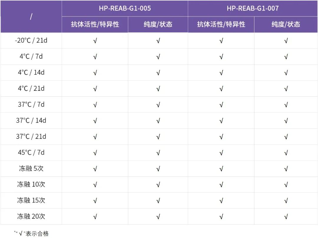 經(jīng)-20℃、4℃、37℃考核 21天,45℃考核7天,反復(fù)凍融20次考核后,對菲鵬生物兩株抗體HP-REAB-G1-005和HP-REAB-G1-007性能進(jìn)行評估,結(jié)果顯示:兩株抗體活性均未出現(xiàn)下降的情況,表明以上抗體穩(wěn)定性良好。