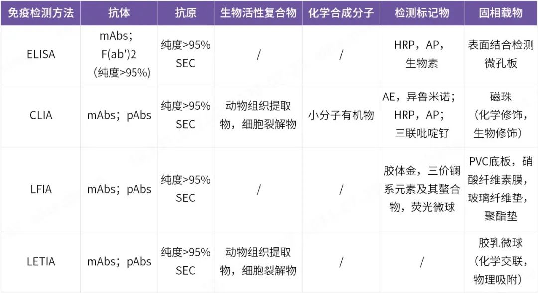 目前常用的免疫檢測方法包括四種:酶聯(lián)免疫吸附試驗(ELISA)、化學(xué)發(fā)光免疫分析(CLIA)、層析免疫分析(LFIA)、乳膠增強比濁免疫分析(LETIA),不同的檢測方法都遵循免疫反應(yīng)的底層原理,即抗原抗體親和反應(yīng),不同檢測方法學(xué)對抗原抗體的應(yīng)用方法不同,所以對抗原抗體的要求也不同。