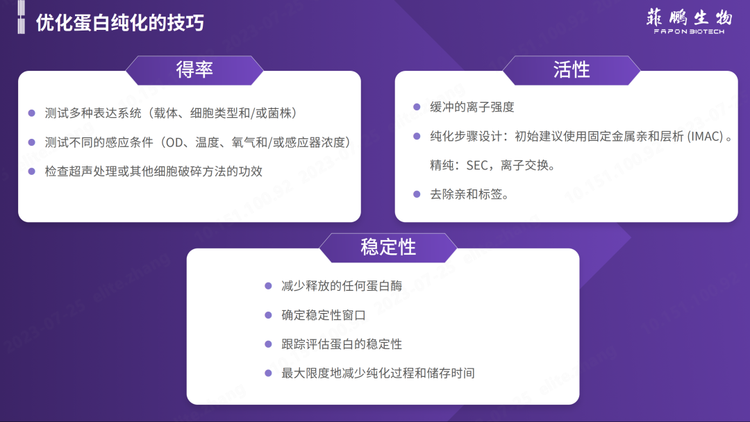在抗原開發(fā)過程中,蛋白質(zhì)樣品的純度水平?jīng)Q定其對下游測試的影響,因此蛋白純度一般是原料廠商最關(guān)心的核心問題。而蛋白表達純化的得率、檢測中的活性和原料的穩(wěn)定性都與蛋白純度有著密切關(guān)系,因此對蛋白純化工藝的優(yōu)化可從以上三方面進行考慮。