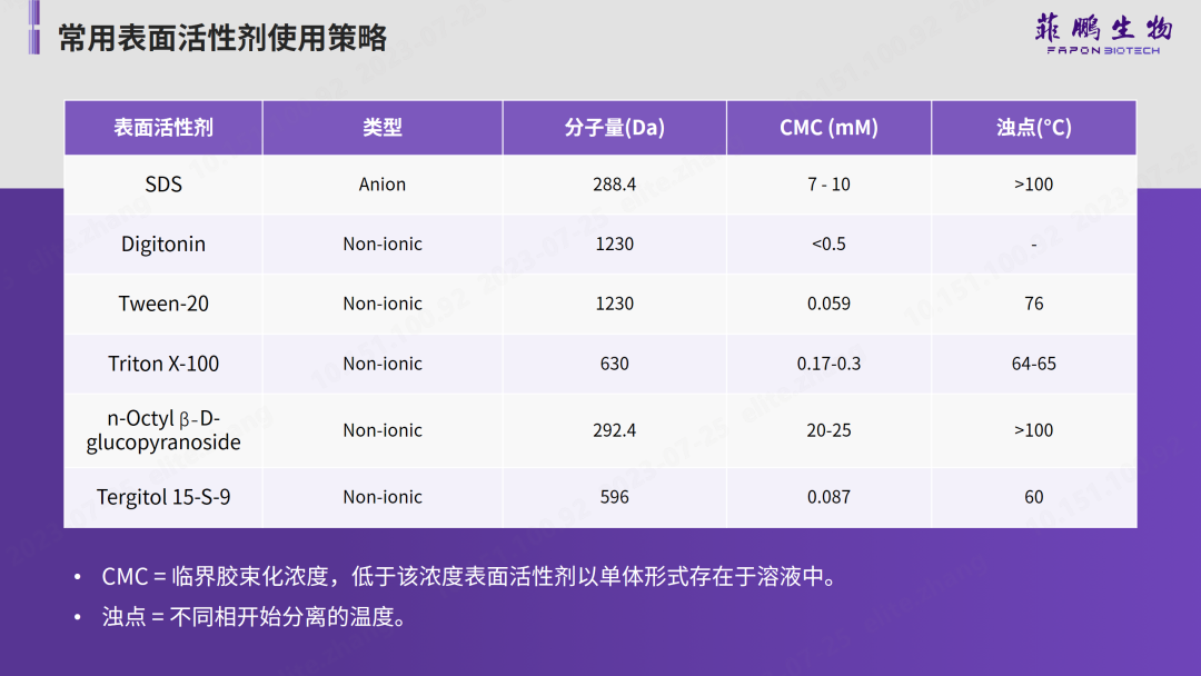 在提取過程中使用表面活性劑也是提高抗原或抗體活性和穩(wěn)定性的一種方法。菲鵬生物總結(jié)了不同表面活性劑的物理性質(zhì)(如下圖),在使用過程中需要從溫度、類型、使用濃度、溶解目標(biāo)和下游檢測影響等進行綜合考慮。例如:SDS是一種強陰離子表面活性劑,容易破壞蛋白,且難以去除,使用時需謹慎;Digitonin可溶解真核細胞膜,但不能溶解原核細胞膜;Triton X-100可溶解細菌內(nèi)膜但不能溶解細菌外膜,此外,Triton X-100還能夠吸收紫外線,對下游檢測會有影響等。