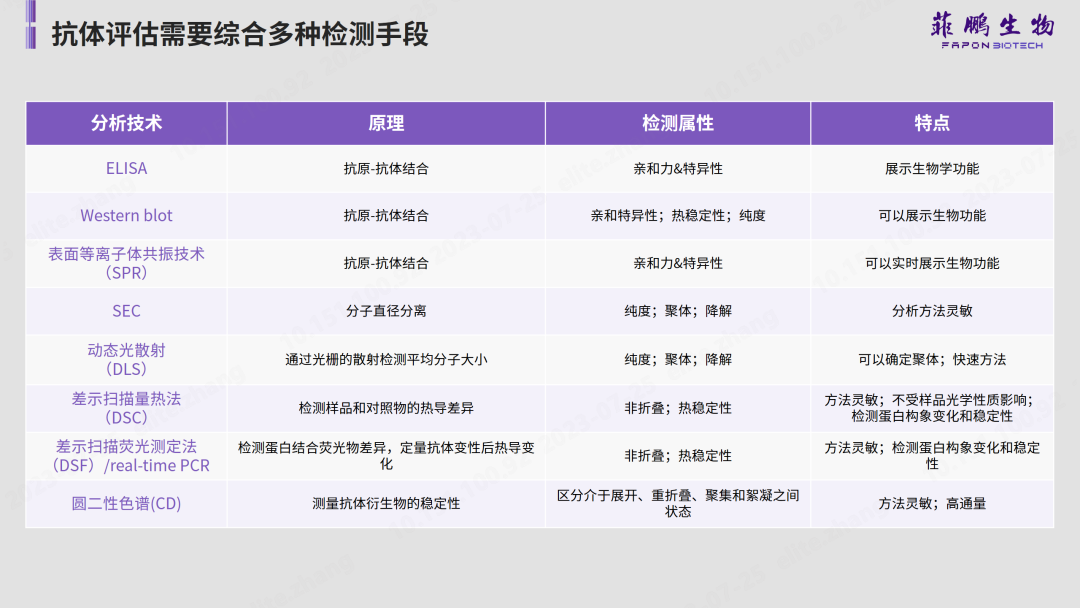 此外,抗體穩(wěn)定性評估還需要借助多種檢測手段來綜合分析。菲鵬生物總結(jié)了八種常用的抗體檢測技術(shù),如通過表面等離子體共振技術(shù)(SPR)分析發(fā)現(xiàn),抗體的親和力能夠決定試劑檢測的靈敏度;動態(tài)光散射(DLS)可用于考察抗體的穩(wěn)定性;抗體純度可通過聚丙烯酰胺凝膠電泳(SDS-PAGE)、體積排阻色譜(SEC-HPLC)、十二烷基硫酸鈉毛細管電泳(CE-SDS)三種方式進行確認;毛細管等電聚焦電泳(CIEF)是檢測分析抗體電荷異構(gòu)體的有效手段。