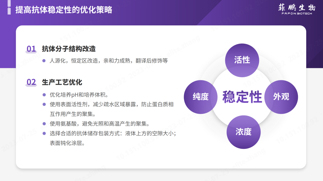 抗體的穩(wěn)定性品控可從濃度、純度、活性和外觀來考量。關(guān)于如何提高抗體的穩(wěn)定性,菲鵬生物建議從抗體工程和生產(chǎn)工藝優(yōu)化兩個方向進行優(yōu)化。
