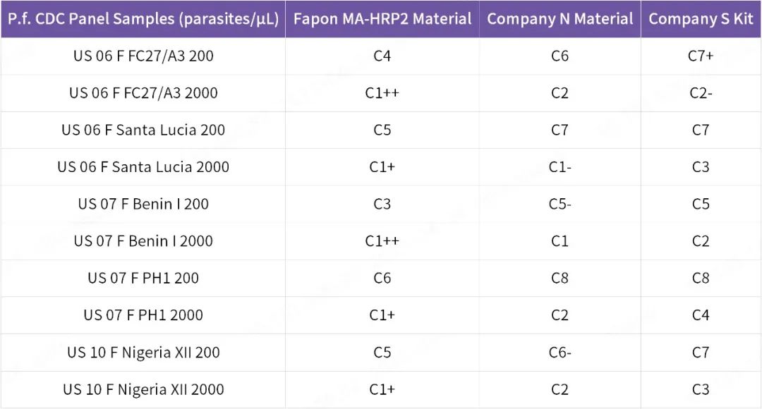 靈敏度對比驗證:將菲鵬生物推薦的HRP2配對株與S公司和N公司的產(chǎn)品同時在WHO-CDC盤上進行檢測,結(jié)果表明,菲鵬生物推薦的配對株靈敏度高于另外2家公司。