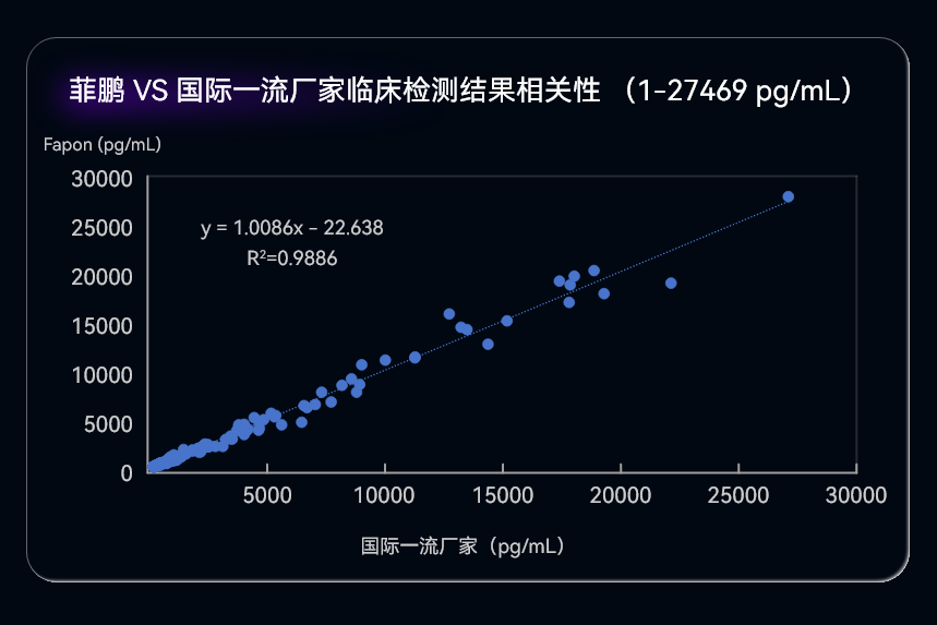 低端檢測(cè)結(jié)果(<100 pg/mL)相關(guān)性也達(dá)R2>0.96,展現(xiàn)出優(yōu)異的臨床診斷性能。